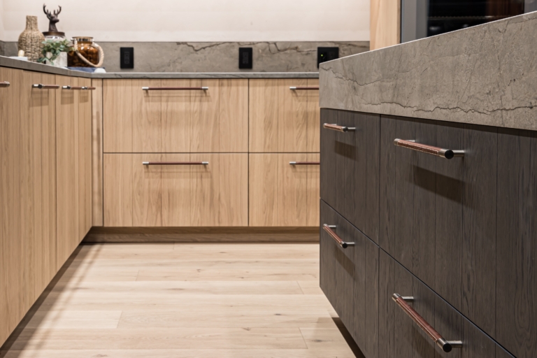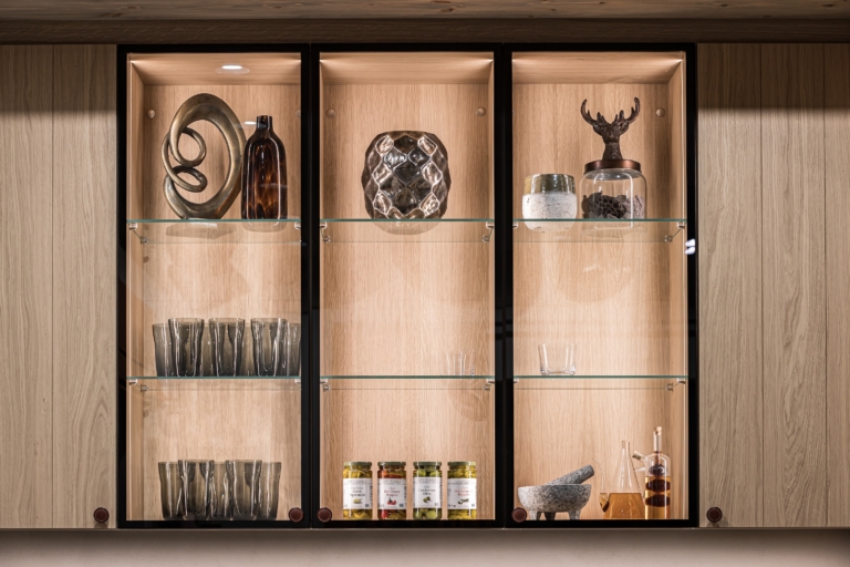 Skapene er laget av børstet eikefiner og er like delikate som de er slitesterke. Innvendig er eksklusive, spesiallagde Evabox- og Blum-skuffer i heltre utstyrt med Blum Legrabox-organisatorer, som tilbyr flotte oppbevaringsløsninger som støtter daglig funksjon uten å gå på kompromiss med estetikken.