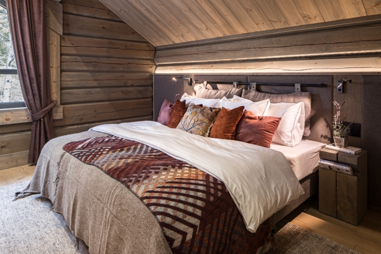 Disse tilleggene fullførte sammen med utvalgte dekorative gjenstander og myke møbler opplevelsen i hytten. LHM Interiør valgte og installerte også alle skreddersydde vindusdekorløsninger, tepper, puter, keramikk og servise, og sørget for at boligen var helt klar til bruk den dagen den ble overlevert.