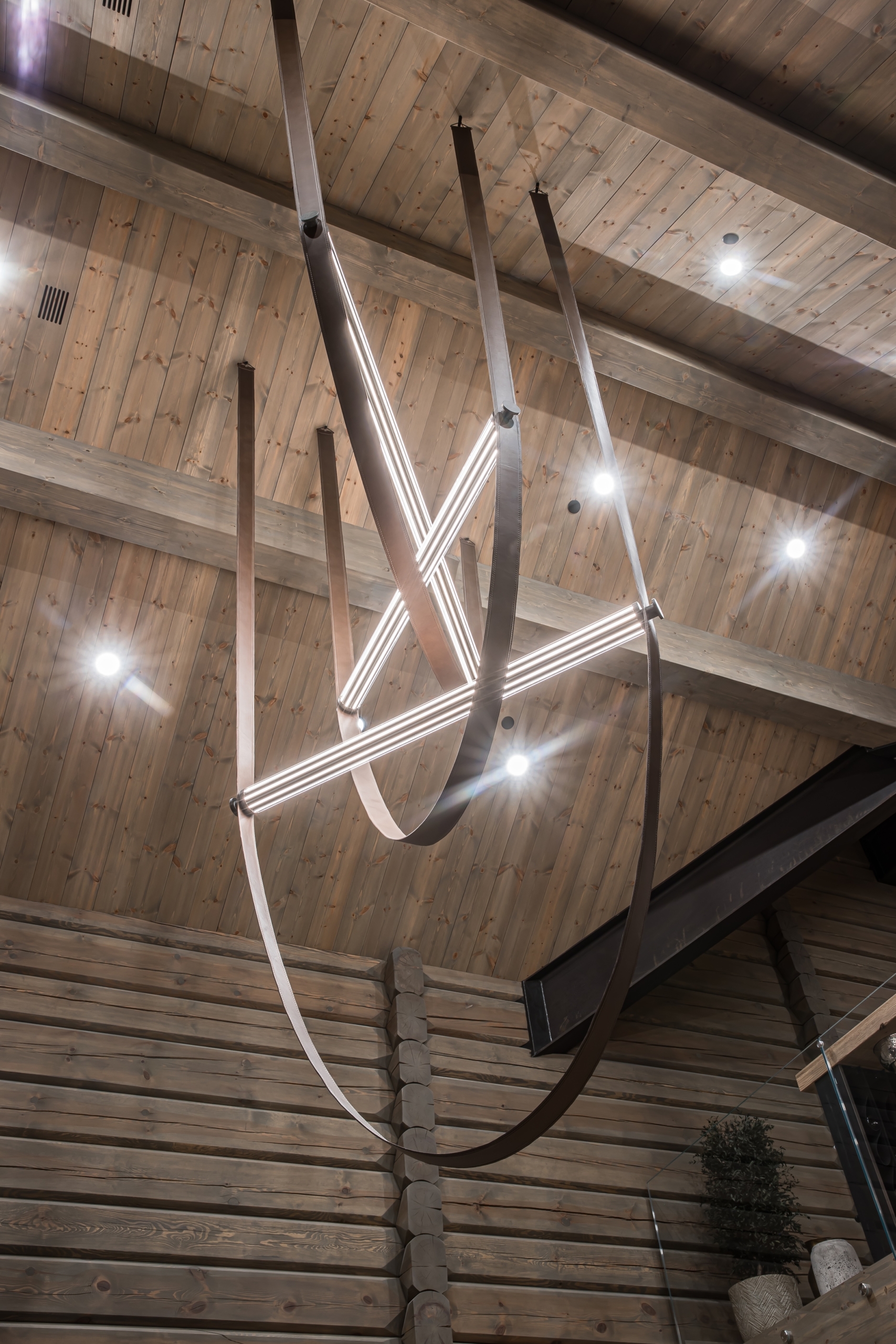 Et sentralt designhøydepunkt var den spesialtilpassede pendellampen, utviklet spesielt for denne hytten. Lampen inneholdt: